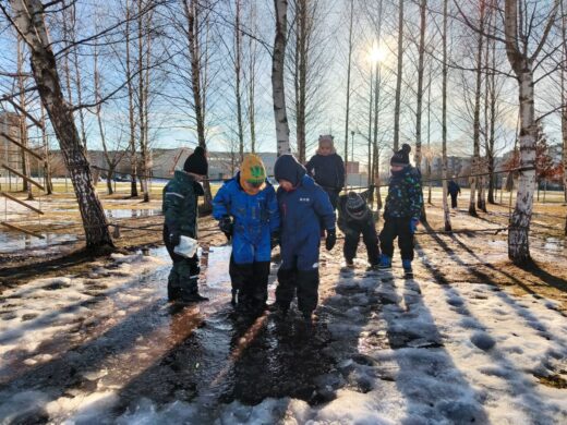 Dėmesio: Berželyje vyksta rimti tyrinėjimai! Arba, kodėl mums tiesiog būtini neperšlampami drabužiai, auliniai ir pirštinės! Patikėkite, darželio kiemas mums – ne šiaip...